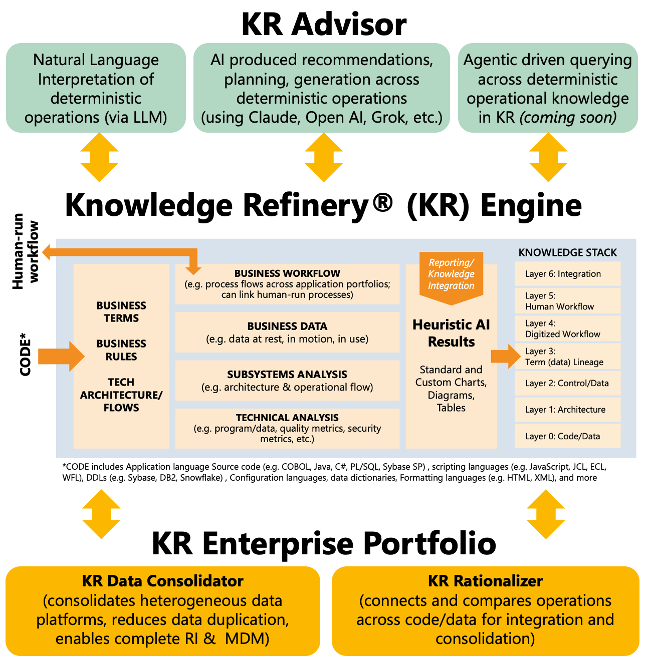 KR uses deterministic extraction to capture the actual operational logic embedded in running applications, databases, and the relationships between them—workflows, data lineage, business rules, business terms, architecture, data structures, and dependencies—and assembles them into a seven-layer Knowledge Stack that is fully traceable, queryable, and ready for both human decision-making and AI consumption.